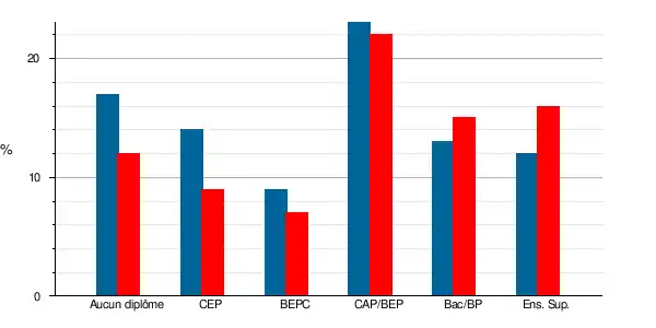 | Aucun diplôme | 771 | 12,3 % | 1015 | 16,8 % | 18,3 | 19,2 | 18,3 | 20 |