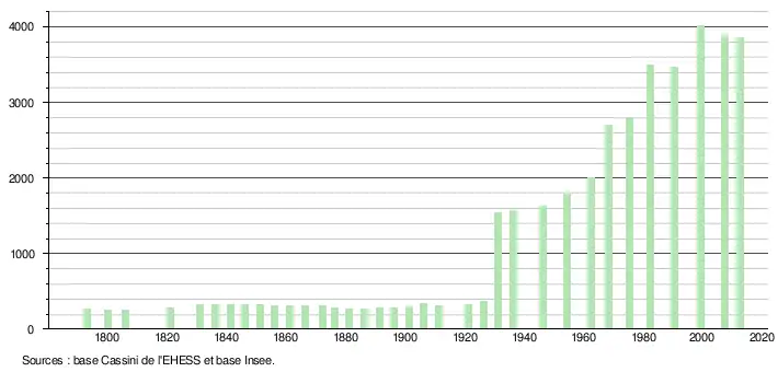 Après être restée stable (en dessous de 500 habitants) jusqu'au milieu des années 1920, la population de la commune augmente fortement dans les années 1930. Augmentant régulièrement jusqu'à aux années 1990, elle atteindra son maximum en 1990 avec 4 020 habitants. Depuis la population est relativement stable.