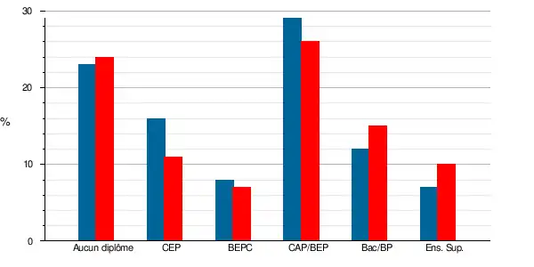 | Titulaires du BEPC, brevet des collèges | 184 | 6,8 % | 210 | 7,8 % | 5,7 | 7,4 | 6,3 | 8,1 |