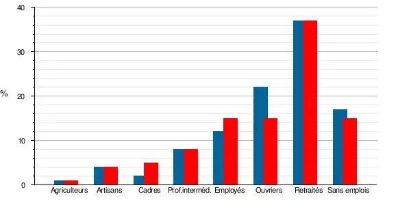 | Artisans, commerçants, chefs d'entreprise | 32 | 3,6 | 28 | 3,5 | 2,8 | 3 | 3,3 | 3,5 |