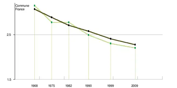 | Nombre de personnes par ménage | 3,14 | 2,77 | 2,77 | 2,49 | 2,3 | 2,2 | -1,14 % | |