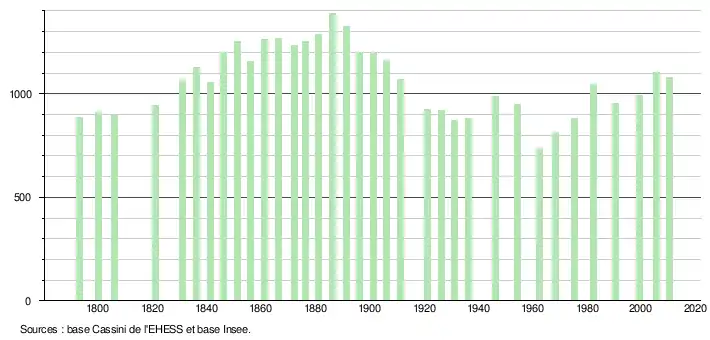 L'évolution du nombre d'habitants est connue à travers les recensements de la population effectués périodiquement dans la commune depuis 1793. Après avoir crû au XIXe siècle et atteint un maximum en 1886 avec 1 386 habitants, la population de la commune décroît jusqu'en 1962 avec un minimum à 734 habitants, croît modérément puis se stabilise au début des années 1980.