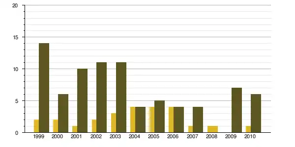 | 1968 à 1975 | 1975 à 1982 | 1982 à 1990 | 1990 à 1999 | 1999 à 2009 | ||