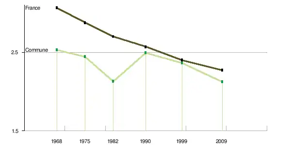 Le taux de natalité est passé de 10,9 ‰ sur la période 1968-1975 à 9,7 ‰ sur la période 1999-2009[5]. Celui du département était sur la période 1999-2009 de 13,1 ‰[6] et celui de la France métropolitaine de 12,8 ‰[8].