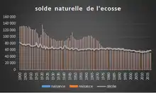En 2002, le nombre des naissances a été le plus bas jamais enregistré avec 51 270 naissances. Ce chiffre a cependant été supérieur en 2004 avec 53 957 naissances, et devrait être encore plus élevé en 2005[3]. Depuis 1997, l’Écosse a été témoin d’un décroissement naturel de population, les décès étant plus nombreux que les naissances. Pour ne citer qu’un exemple, pour l’année 2004, il y a eu 4 012 décès de plus que de naissances.