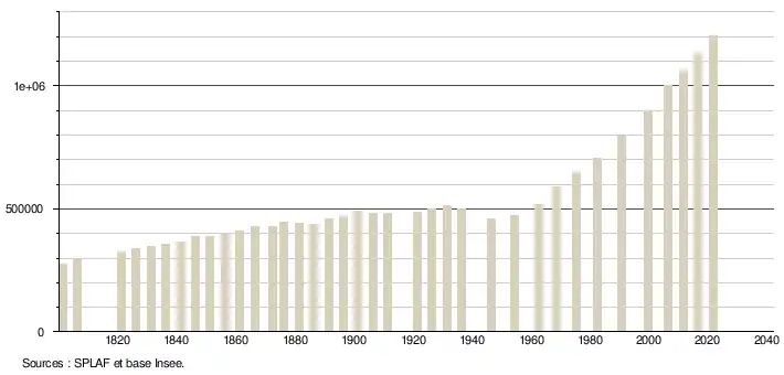 (Sources : SPLAF - population totale du département depuis sa création jusqu'en 1962[5] − puis base Insee − population sans doubles comptes de 1968 à 2006[6] puis population municipale à partir de 2006[7].)