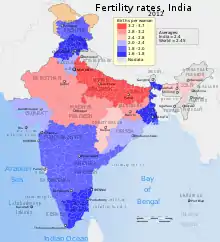 En 2021, le taux de fécondité en Inde s'élève à 2,0 enfants par femme et est passé pour la première fois en dessous du seuil de renouvellement de sa population[26]. Pour comparaison, l'indice est de 3,5 au Pakistan (en 2021) et de 2,0 au Bangladesh (en 2021). Le taux de fécondité en Inde est calculé par l'intermédiaire de sondages à grande échelle.