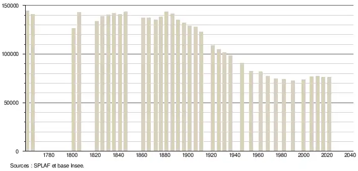 L’évolution démographique entre la Guerre franco-prussienne de 1870 et la Première Guerre mondiale est toujours à la baisse. Sur cette période, la population perd 12 452 habitants, soit une baisse de -9,21 % alors qu’elle croît de 10 % au niveau national. La population perd 9,50 % pour la période de l’entre-deux guerres courant de 1921 à 1936 parallèlement à une croissance au niveau national de 6,9 %.