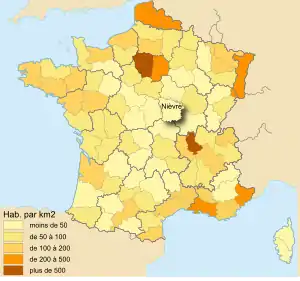 La densité de population de la Nièvre, 29,7 habitants par kilomètre carré en 2021, est trois fois inférieure à celle de la France entière qui est de 106,5 hab./km2 pour la même année.