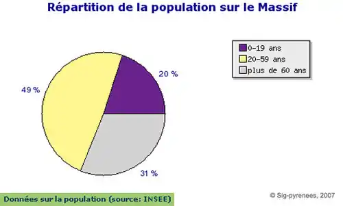Évolution : après une forte diminution durant la période 1968 - 1990, la population s'est globalement stabilisée entre 1990 et 1999 (comparaison France : + 3,5 % sur cette période). Les nombreux massifs montagneux limitent le développement démographique, ainsi la population se concentre essentiellement dans la zone du piémont pyrénéen et sur les façades atlantiques et méditerranéennes. La proportion de la population jeune (moins de 20 ans) est plus faible que la moyenne nationale alors que la proportion de la population âgée (plus de 60 ans) est plus importante. La zone Massif s’étend sur 18 176,6 km2. En 1999, la densité était de 26,5 habitants par km² (en comparaison, les densités départementales sont de 28 hab/km2 pour l'Ariège, 50 hab/km2 pour l'Aude et les Hautes-Pyrénées, 80 hab/km2 et plus pour les Pyrénées-Atlantiques et les Pyrénées-Orientales et plus de 160 hab/km2 pour la Haute-Garonne).