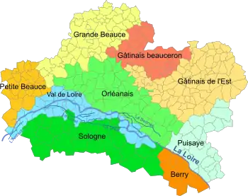 Le territoire du Loiret peut être décomposé en neuf régions naturelles de faible relief. Dans le nord du département, à l'ouest du Loing, la Beauce (Petite Beauce et Grande Beauce) et le Gâtinais beauceron sont formés de sols calcaires et de limons favorables à l'activité agricole. À l'est et au sud-est du Loing, les terrains du Gâtinais et de la Puisaye sont moins fertiles, du fait de la présence de grès et d'argile à silex. L'Orléanais au centre, la Sologne au sud et l'extrémité du Berry au sud-est offrent un territoire pauvre et peu perméable, composés d'argiles et de sable. Entre les deux, la zone alluvionnaire du Val de Loire, aux terres fertiles et irriguées est propice aux cultures spécialisées[A 1].