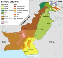 Le Pakistan compte une importante diversité ethnique et linguistique, la langue maternelle étant par ailleurs souvent liée au groupe ethnique. Le pays est toutefois relativement dominé par les Pendjabis qui comptent pour près de la moitié de la population (48 %) depuis la sécession du Bangladesh en 1971. Les Sindis ont longtemps formé le deuxième groupe ethnique jusqu'à être dépassé par les Pachtounes, les deux groupes formant près de 15 % de la population chacun en 2017. Les Saraikis (8 %), les Muhadjirs (7 %) et les Baloutches (4 %) forment les autres groupes importants[24].