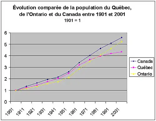 L'évolution comparée de la population du Québec, de l'Ontario et du Canada, montre que le Québec avait une démographie relativement dynamique jusqu'en 1961. La population a même cru à un rythme plus rapide qu'en Ontario entre 1901 et 1961. À partir de 1961, cependant, la croissance de la population québécoise fléchit considérablement, accélérant la chute de son poids relatif dans la fédération canadienne.