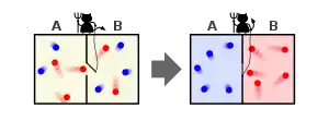 Dans sa version originale, la température est supérieure dans le compartiment B à ce qu'elle est dans le compartiment A. Or la température est proportionnelle à la vitesse quadratique moyenne des molécules. Le démon laisse passer du compartiment B au compartiment A les molécules de B plus lentes que la vitesse moyenne des molécules du compartiment A, et laisse passer de A à B les molécules de A plus rapides que la vitesse moyenne des molécules dans B. Résultat : la température dans B a augmenté tandis que celle de A est réduite : on a donc refroidi une source froide à partir d'une source chaude, ce que la seconde loi de la thermodynamique a justement pour objet d'interdire. On diminue donc l'entropie totale du système.