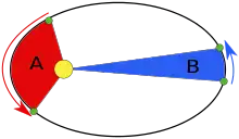 Soit A(t) l'aire de la surface balayée par le rayon vecteur durant le mouvement, alors cette seconde loi indique que des aires égales sont balayées dans des temps égaux.