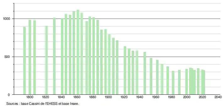 L'évolution du nombre d'habitants est connue à travers les recensements de la population effectués dans la commune depuis 1793. Pour les communes de moins de 10 000 habitants, une enquête de recensement portant sur toute la population est réalisée tous les cinq ans, les populations légales des années intermédiaires étant quant à elles estimées par interpolation ou extrapolation[29]. Pour la commune, le premier recensement exhaustif entrant dans le cadre du nouveau dispositif a été réalisé en 2004[30].