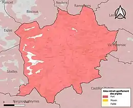 Le retrait-gonflement des sols argileux est susceptible d'engendrer des dommages importants aux bâtiments en cas d’alternance de périodes de sécheresse et de pluie. 97,1 % de la superficie communale est en aléa moyen ou fort (94,5 % au niveau départemental et 48,5 % au niveau national). Sur les 208 bâtiments dénombrés sur la commune en 2019, 204 sont en aléa moyen ou fort, soit 98 %, à comparer aux 93 % au niveau départemental et 54 % au niveau national. Une cartographie de l'exposition du territoire national au retrait gonflement des sols argileux est disponible sur le site du BRGM[26],[Carte 3].