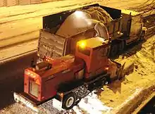 Une fois que les précipitations ont pris fin et que le déblaiement est effectué, les déneigeurs procèdent au chargement des andains pour dégager complètement les voies de circulation[14]. Cette étape est courante dans les villes où l'espace est limité pour l'entassement sur place de la neige. Il est cependant moins commun dans les banlieues ou en zone rurale.