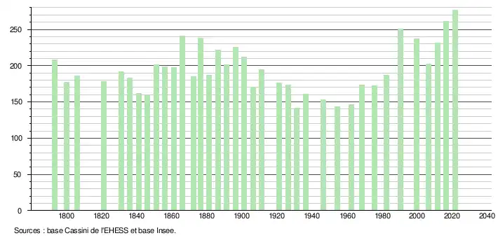 L'évolution du nombre d'habitants est connue à travers les recensements de la population effectués dans la commune depuis 1793. Pour les communes de moins de 10 000 habitants, une enquête de recensement portant sur toute la population est réalisée tous les cinq ans, les populations légales des années intermédiaires étant quant à elles estimées par interpolation ou extrapolation[22]. Pour la commune, le premier recensement exhaustif entrant dans le cadre du nouveau dispositif a été réalisé en 2006[23].