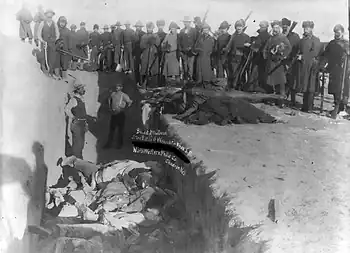 Benjamin Madley a noté que la Convention sur le génocide désigne le génocide comme un crime commis en temps de «paix» ou de guerre. Il a fait valoir que la violente résistance autochtone aux campagnes génocidaires a été décrite comme une «guerre» ou des «batailles», plutôt que comme des massacres génocidaires. Certains massacres peuvent être qualifiés de massacres génocidaires[28]: