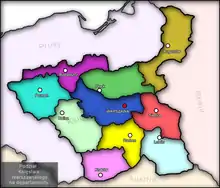 Division administrative du duché de Varsovie, 1810-1815. Le département de Płock est en vert, au nord.