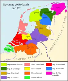 Peu après l'instauration du royaume de Hollande, le , on découpa le département de Hollande en deux départements : le Maasland au sud et l'Amstelland au nord. En 1807, la Frise orientale prussienne et le Jeverland (en) furent ajoutés au royaume de Hollande et constituèrent le nouveau département de Frise-Orientale. En décembre 1807 Flessingue fut placée sous administration française ; en décembre 1809 Walcheren subit le même sort. Le , tout le territoire situé au-delà du Waal et du Merwede fut annexé par la France. L'ancien département de Brabant disparut alors et son territoire fut divisé entre les Deux-Nèthes (département créé en 1795) et le nouveau département français des Bouches-du-Rhin. Les fractions du Maasland et de la Gueldre situées au sud du Waal rejoignirent également les Bouches-du-Rhin.