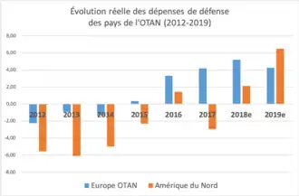 La tendance à la baisse s'inverse en 2016 en Europe : cette année là, les dépenses de défense des pays européens de l'OTAN augmentent de 3,31 % en termes réels[alpha 1]. Aux États-Unis, les budgets militaires repartent à la hausse avec l'arrivée de Donald Trump à la présidence, qui met fin aux années de baisse voulues par Barack Obama. Ces évolutions récentes ne modifient pas substantiellement l'écart entre les États-Unis qui consacrent en 2019 à leur défense 730 milliards US$, contre 284 milliards US$ au total pour les pays d'Europe membres de l'OTAN, soit 2,5 fois plus[1].