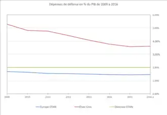 La baisse des dépenses de Défense des pays membres de l'OTAN, amorcée depuis la fin de la guerre froide, se poursuit au cours des années 2010. L'écart est important entre les Européens et les États-Unis dont l'effort de dépense exprimé en pourcentage du PIB est entre 2014 et 2016 en moyenne deux fois et demi plus élevé que celui de leurs alliés européens de l'OTAN. Cette différence s'explique en partie par le rôle mondial des États-Unis et leur engagement dans les guerres d'Afghanistan et d'Irak. Les États-Unis continuent d'être à un niveau de dépenses militaires très supérieur à tous les grands pays industrialisés occidentaux ce qui entretient tout à la fois leur poids prépondérant au sein de l'Alliance et leur demande que les Européens en fassent davantage pour leur sécurité. En 2015, alors que les États-Unis représentent 45,9 % du PNB des membres de l'OTAN, leur budget de la Défense compte pour 71,9 % du total de ses membres[2].