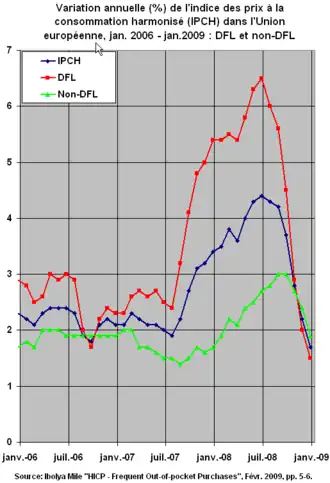 De plus, depuis , et pour la première fois en 12 ans, l’indice des prix des DFL croît moins vite que celui des non-DFL (second graphique). Pour certains observateurs à cette époque, ce phénomène était susceptible d'entraîner chez un grand nombre de consommateurs un ressenti de la hausse des prix moindre que l'inflation réelle et par voie de conséquence une reprise de la consommation des ménages[4].