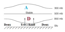- au-dessus des océans, la masse d'air est assez homogène verticalement grâce à un mélange par la turbulence dans la couche limite océanique qui est en général assez mince (environ 50 m) et le réchauffement est aussi lent à cause de la grande capacité thermique de la mer ;