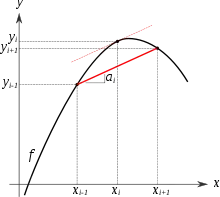 Graphiquement, cela revient à remplacer la tangente par la corde. Ceci peut se justifier par le théorème des accroissements finis : on sait qu'il existe un point de l'intervalle pour lequel la dérivée est la pente de la corde, et si l'intervalle est petit, alors ce point est proche du milieu . Cette méthode est automatisable sur les calculatrices programmables et les ordinateurs.