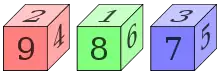 Un jeu de trois dés utilisant tous les nombres de 1 à 18 peut être rendu non transitif avec la combinaison suivante :
