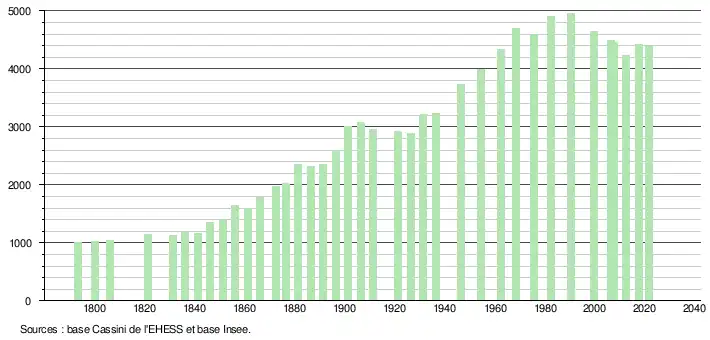 L'évolution du nombre d'habitants est connue à travers les recensements de la population effectués dans la commune depuis 1793. Pour les communes de moins de 10 000 habitants, une enquête de recensement portant sur toute la population est réalisée tous les cinq ans, les populations légales des années intermédiaires étant quant à elles estimées par interpolation ou extrapolation[32]. Pour la commune, le premier recensement exhaustif entrant dans le cadre du nouveau dispositif a été réalisé en 2007[33].