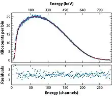 L’énergie de désintégration (basée sur les masses du neutron, du proton et de l’électron fournies par le CODATA 2014[5]) est égale à 0,782 333 05 MeV. Cette valeur est en accord avec l’énergie maximale de l’électron produit lors de la désintégration qui a été mesurée à 0,782 ± 0,013 MeV[6]. Cette dernière valeur n’est pas assez précise pour déterminer la masse au repos de l’antineutrino (qui doit en théorie être soustraite de l’énergie cinétique maximale de l’électron) ; celle-ci est contrainte par d’autres méthodes[7]. Par ailleurs, l’énergie cinétique maximale du proton est 751 eV[8].