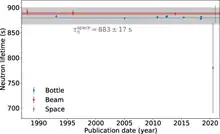 Or, les mesures effectuées depuis les années 1990 par les deux types de mesures donnent des résultats divergents comme le montre la figure ci-contre. Les mesures utilisant la technique de la désintégration en vol donnent une valeur moyenne de la durée de vie moyenne du neutron de 888,0 ± 2,0 s tandis que les expériences utilisant la technique du stockage donnent en moyenne 879,6 ± 0,6 s[2]. Les résultats des mesures réalisées suivant les deux méthodes diffèrent donc d’environ 8 secondes, ce qui est bien supérieur aux incertitudes associées aux résultats de chacun des deux types de mesure. La probabilité d’obtenir une telle différence, du seul fait du hasard, est très faible[alpha 1],[2].