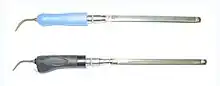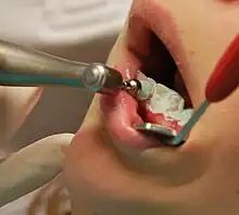 - la piézoélectricité : vibration d'un insert mixte céramique - métal : la majorité des cabinets dentaires utilisent ces matériels, dits piézoélectriques[4].