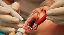 De l'eau est constamment projetée, ce qui permet à la fois de refroidir le processus, d'éliminer les débris de tartre, et la salive. L'ensemble est éliminé par une aspiration simultanée[5].