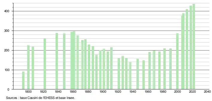 L'évolution du nombre d'habitants est connue à travers les recensements de la population effectués dans la commune depuis 1793. Pour les communes de moins de 10 000 habitants, une enquête de recensement portant sur toute la population est réalisée tous les cinq ans, les populations légales des années intermédiaires étant quant à elles estimées par interpolation ou extrapolation[19]. Pour la commune, le premier recensement exhaustif entrant dans le cadre du nouveau dispositif a été réalisé en 2007[20].