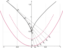 Construction de deux développantes (en rose) d'une parabole semi-cubique (en noir).