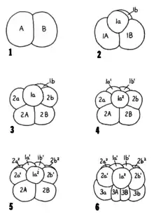 Figure montrant les différents stades de développement cellulaire lors de la division cellulaire et annotée conséquemment avec les délétions de l'expérience de Boyer en 1971. - Quelques années plus tard, les chercheurs John B. Morrill, Claudia A. Blair et William J. Larsen du département de biologie de l'Université de Wesleyan se penchent sur les capacités régulatrices d'un gastéropode, Lymnaea palustris lors de la délétion de cellules au stade 2,4,8 et 16 de la division cellulaire. Ils utilisent alors des aiguilles de verre ou l'agitation des œufs comme Hans Driesch pour faire les différentes délétions. Les résultats pour la délétion d'une cellule au premier stade de la division cellulaire sont encore une fois identiques aux résultats obtenus dans les expériences de développement à régulation précédente avec 39 des 444 œufs qui se sont développés normalement démontrant que Lymnaea palustris est un gastéropode avec une capacité régulatrice, mais que celle-ci ne permet pas de sauver tous les individus. En effet, c'est moins de 9 % des œufs qui se sont développés normalement, un peu moins de 4 % avec la méthode de l'aiguille et un peu plus de 20 % avec la technique de l'agitation des œufs. Les résultats pour les autres délétions ont donné d'autres individus normaux pour le stade 4 de la division cellulaire. Il s'agit donc de la deuxième espèce avec clivage spiralé chez laquelle on a la preuve de capacité régulatrice symbole de développement à régulation[5].