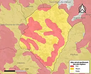 Le retrait-gonflement des sols argileux est susceptible d'engendrer des dommages importants aux bâtiments en cas d’alternance de périodes de sécheresse et de pluie[20]. 99,9 % de la superficie communale est en aléa moyen ou fort (91,8 % au niveau départemental et 48,5 % au niveau national)[Carte 2]. Depuis le , en application de la loi ELAN, différentes contraintes s'imposent aux vendeurs, maîtres d'ouvrages ou constructeurs de biens situés dans une zone classée en aléa moyen ou fort[Note 2],[21].