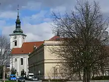 - Statues des patrons de Moravie et de toute l'Europe Cyrille et Méthode (1901) et Saint Jean Népomucène (1826) à côté de l'église