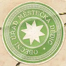 Sur les timbres du bureau municipal de la ville de Dědice de la seconde moitié du XIXe siècle et de la première moitié du XXe siècle, nous rencontrons une simple étoile à huit branches. Cette typographie, attestée par un sceau du cadastre de Joseph II datant de 1787 avec une étoile brillante à huit branches, a également été utilisée dans des documents importants au XIXe siècle. La description du sceau en papier du début du XXe siècle indique : « Bureau municipal de la ville de Dědice ». La couleur du sceau en papier utilisé dans le cahier imite la couleur de la cire verte utilisée par les villes médiévales. L'étoile à huit branches n'est pas rendue brillante ici. L'étoile et le texte de la description sont blancs.
