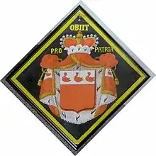| Blasonnement | "De gueules, au chef d'argent, chargé de trois merlettes du champ." |