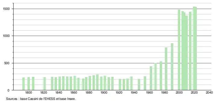 L'évolution du nombre d'habitants est connue à travers les recensements de la population effectués dans la commune depuis 1793. Pour les communes de moins de 10 000 habitants, une enquête de recensement portant sur toute la population est réalisée tous les cinq ans, les populations légales des années intermédiaires étant quant à elles estimées par interpolation ou extrapolation[16]. Pour la commune, le premier recensement exhaustif entrant dans le cadre du nouveau dispositif a été réalisé en 2004[17].