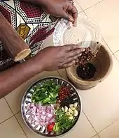 Les produits généralement utilisés sont la viande de bœuf ou de mouton, le riz, du poisson séché et du yet, de la poudre et/ou de la pâte d'arachide, des graines de nététou (Parkia biglobosa), du concentré de tomate et un assaisonnement[3].