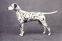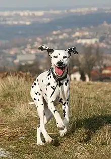 Le dalmatien est une race de chien originaire de Dalmatie, une région de la Croatie. Apparenté au chien courant, le dalmatien est de taille moyenne, musclé, actif, harmonieux dans ses lignes et doté d'un trot remarquable. Selon la FCI, il est d'un caractère calme, têtu, intelligent, protecteur et câlin. Sa robe a pour base le blanc et comporte des taches rondes bien dessinées pouvant être noires ou foies. Le dalmatien est un chien sportif et gai qui a besoin de se dépenser. La race s'illustre dans les sports comme l'agility, le cani-cross et l'obé rythmée.