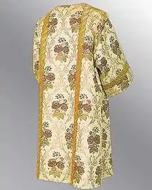 En forme de croix avec des manches courtes, la dalmatique se décline selon les couleurs du temps liturgique. Elle est portée par le diacre lors de la messe, des processions et des vêpres. Ce vêtement est dérivé d'un vêtement civil romain, et son usage liturgique remonte au IVe siècle.