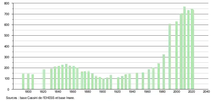 L'évolution du nombre d'habitants est connue à travers les recensements de la population effectués dans la commune depuis 1793. Pour les communes de moins de 10 000 habitants, une enquête de recensement portant sur toute la population est réalisée tous les cinq ans, les populations légales des années intermédiaires étant quant à elles estimées par interpolation ou extrapolation[24]. Pour la commune, le premier recensement exhaustif entrant dans le cadre du nouveau dispositif a été réalisé en 2005[25].