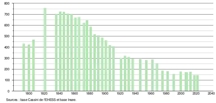 L'évolution du nombre d'habitants est connue à travers les recensements de la population effectués dans la commune depuis 1793. Pour les communes de moins de 10 000 habitants, une enquête de recensement portant sur toute la population est réalisée tous les cinq ans, les populations légales des années intermédiaires étant quant à elles estimées par interpolation ou extrapolation[22]. Pour la commune, le premier recensement exhaustif entrant dans le cadre du nouveau dispositif a été réalisé en 2007[23].
